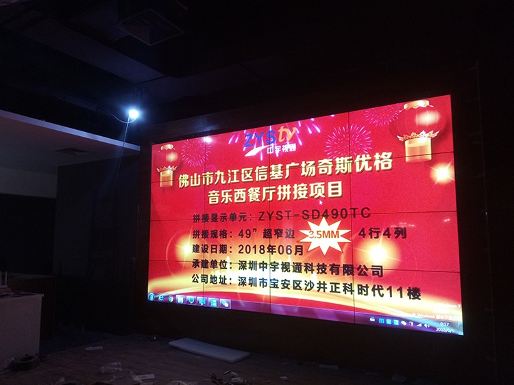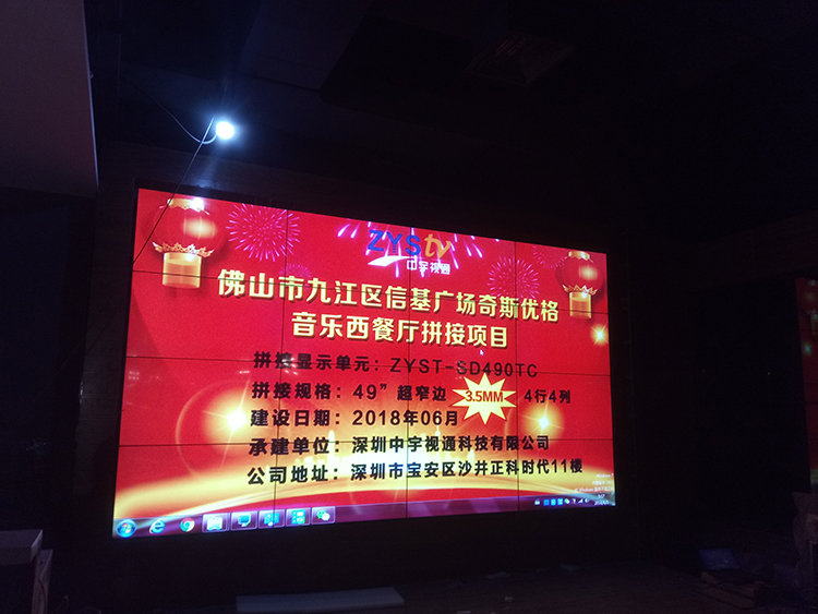 佛山市九江區(qū)信基廣場奇斯優(yōu)格音樂西餐廳選擇中宇視通科技4*4片49寸*3.5mm拼縫液晶拼接屏,項目整體安裝完成,安裝以后奇斯優(yōu)格音樂西餐廳高端大氣上檔次,信基廣場附近的朋友可以去體驗一番不一樣的風(fēng)格,奇斯優(yōu)格音樂西餐廳_時尚前衛(wèi)裝修+口味獨特出眾,鎖客+吸金,一步到位!奇斯優(yōu)格音樂西餐廳音樂曲庫,擁有由1100萬首單曲組成,可以幫助您提升音樂氛圍.以時間,空間,客流量等不同維度設(shè)計的多種音樂場景,滿足您的不同音樂播放需求。
