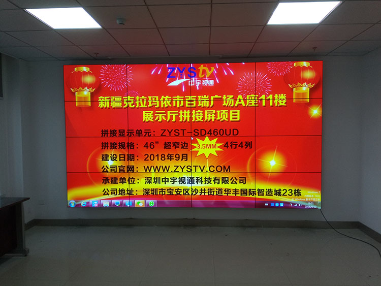 新疆克拉瑪依市百瑞廣場A座11樓展示廳46寸拼縫3.5mm超窄邊拼接屏項目,安裝調試完成并順利通過驗收,中宇視通全體同事從深圳發來賀電!