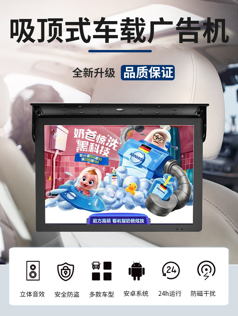中宇視通是18.5寸車載廣告機生產廠家,我們提供吸頂車載廣告機、背掛車載廣告機、折疊式車載廣告機多種安裝方式,滿足各種車型,內置抗振設計,減少車載環境內震動對機器本身的影響,能讓機器在特殊情況中穩定運行。