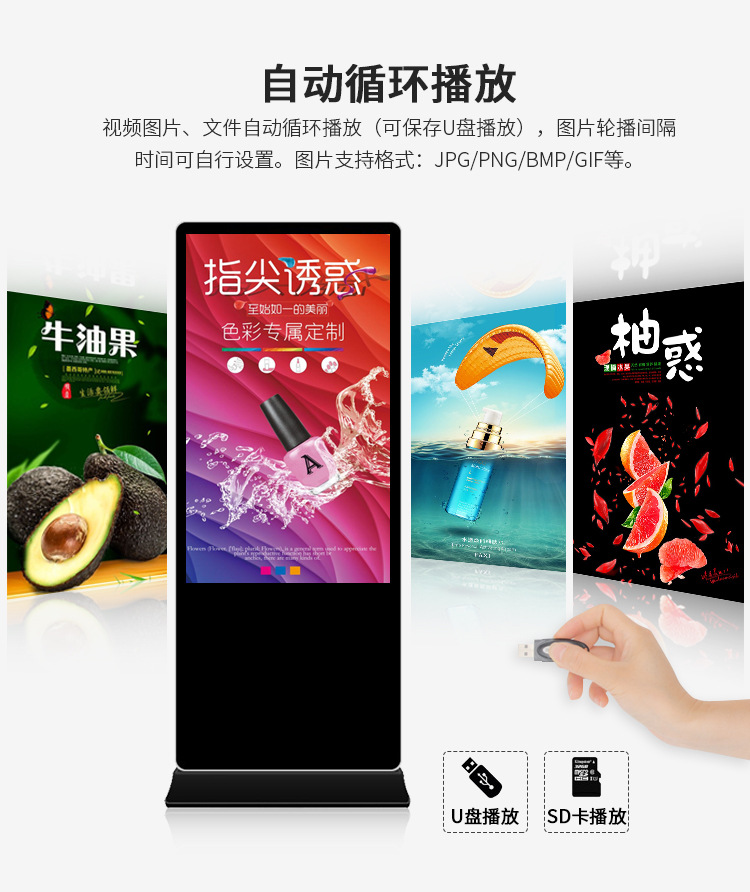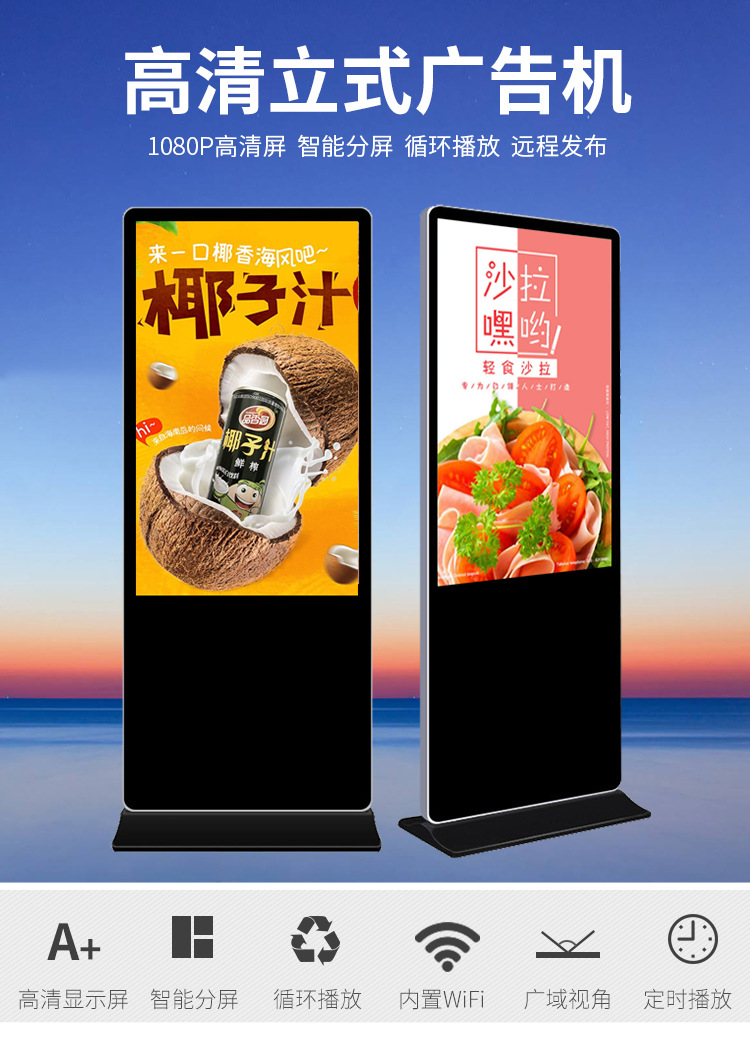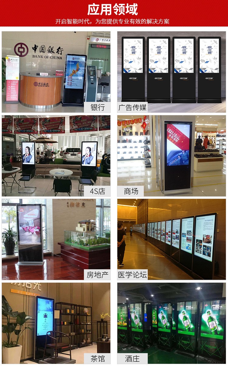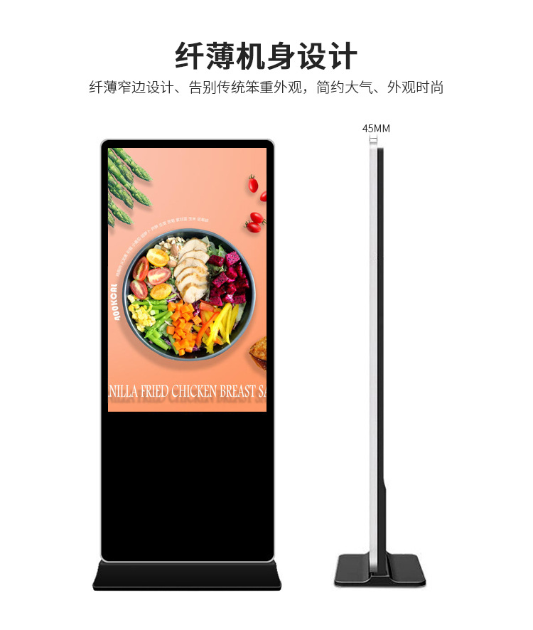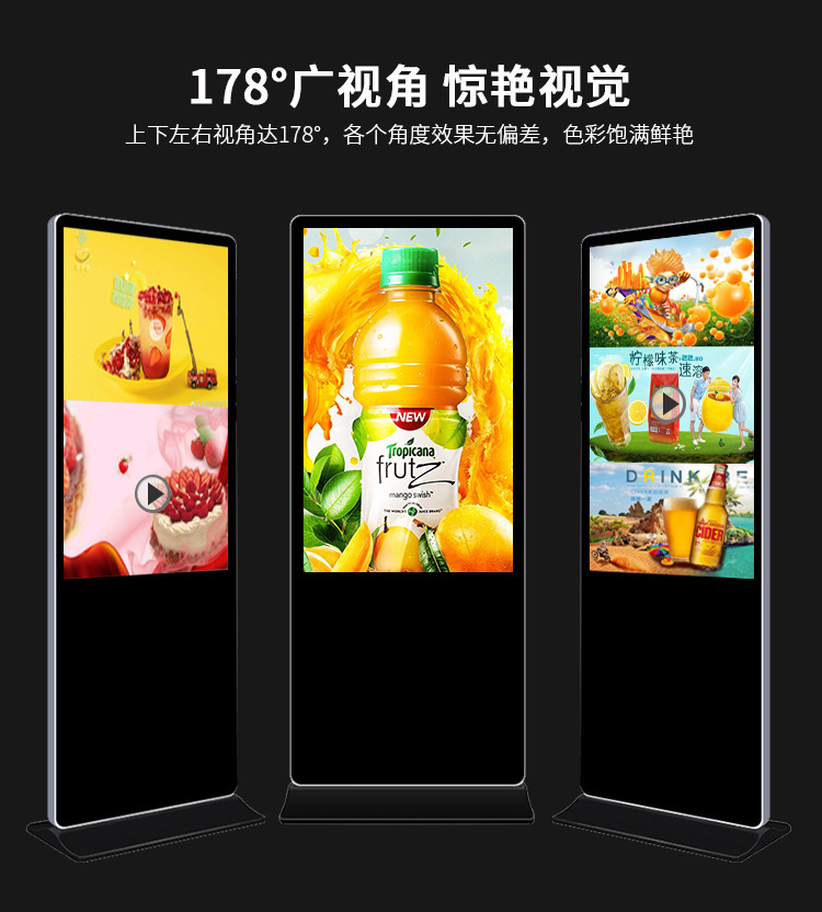 42寸立式液晶廣告機系列產品屬于壁掛、落地式數字標牌廣告機,外觀優美,全身五金冷軋鋼板噴涂,邊條鋁合金型材,面板4MM專用鋼化玻璃,橫式16:9液晶屏,高清效果。內屏采用三星、LG原裝工業級液晶屏,配以最先進的密集型LCD光源背光系統,背光色彩還原度好,超高對比度,強光下依然清晰無比。特別適合高端品牌的綜合多媒體技術,向消費者傳遞全方位的產品信息,促銷信息等。提升產品在銷售終端的顯現率和陳列效果,刺激沖動性購買。相比于其他傳統媒體和促銷方式,投入極低廉,性價比極高。