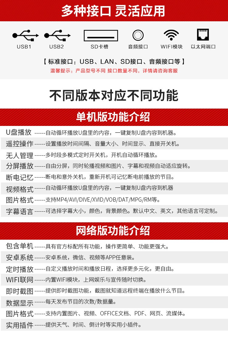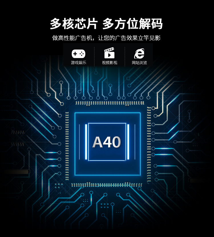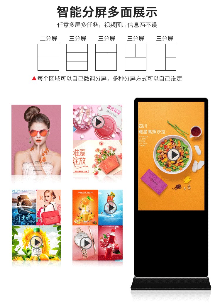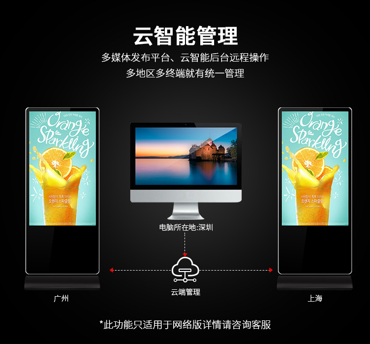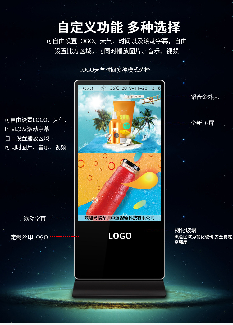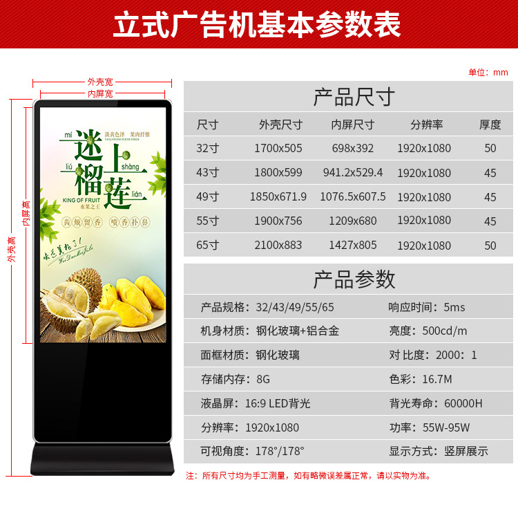 42寸立式液晶廣告機系列產品屬于壁掛、落地式數字標牌廣告機,外觀優美,全身五金冷軋鋼板噴涂,邊條鋁合金型材,面板4MM專用鋼化玻璃,橫式16:9液晶屏,高清效果。內屏采用三星、LG原裝工業級液晶屏,配以最先進的密集型LCD光源背光系統,背光色彩還原度好,超高對比度,強光下依然清晰無比。特別適合高端品牌的綜合多媒體技術,向消費者傳遞全方位的產品信息,促銷信息等。提升產品在銷售終端的顯現率和陳列效果,刺激沖動性購買。相比于其他傳統媒體和促銷方式,投入極低廉,性價比極高。